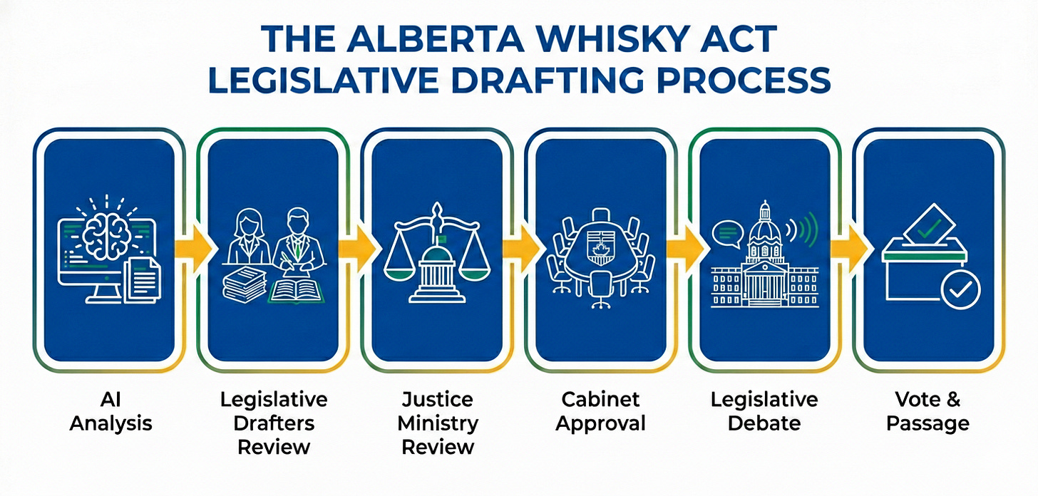 We’re using artificial intelligence to assist in the initial drafting of the Alberta Whisky Act. The AI will analyze existing whisky regulations from around the world - Scottish whisky laws, American bourbon standards, Canadian regulations, Irish whiskey rules. It will process thousands of pages of legal text, identify relevant provisions, understand the patterns and structures that make these regulations effective, and draft initial legislative language based on proven frameworks.